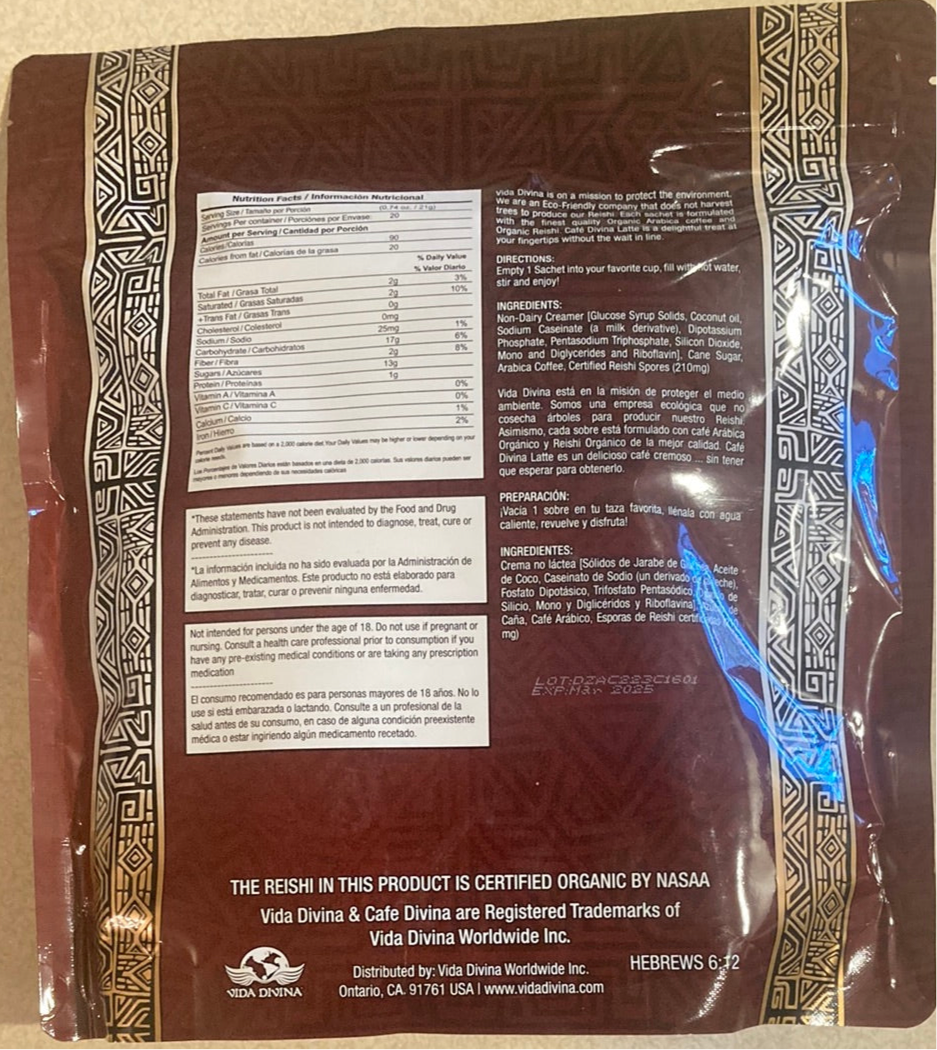 Cafe Divina Latte Premium Coffee Extract, Sugar, and Non-Dairy Creamer. Formulated with Arabica Coffee for a Unique Taste and Healthy Lifestyle Certified REISHI Spores. 20 Sachets