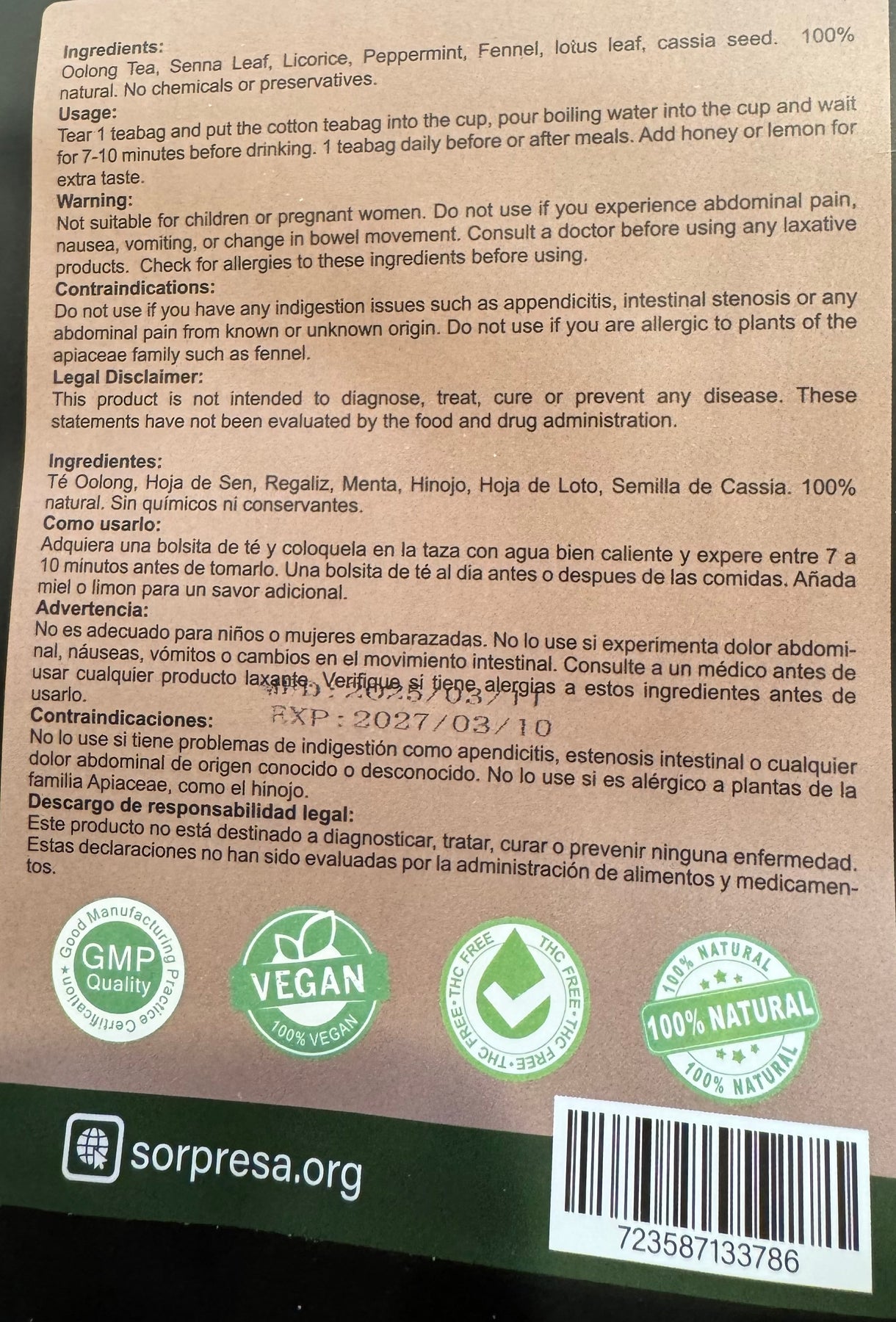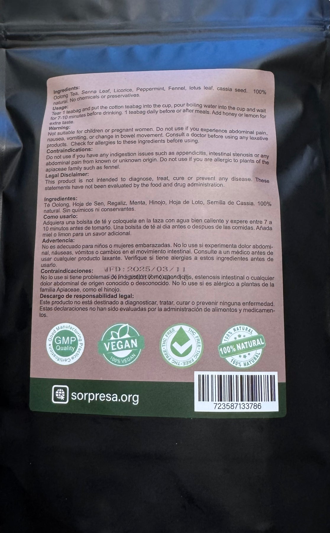 Oolong Tea, Senna Leaf, Licorice, Peppermint, Fennel, Lotus Leaf, Cassia Seed, 100 % Natural. No chemicals or preservatives.