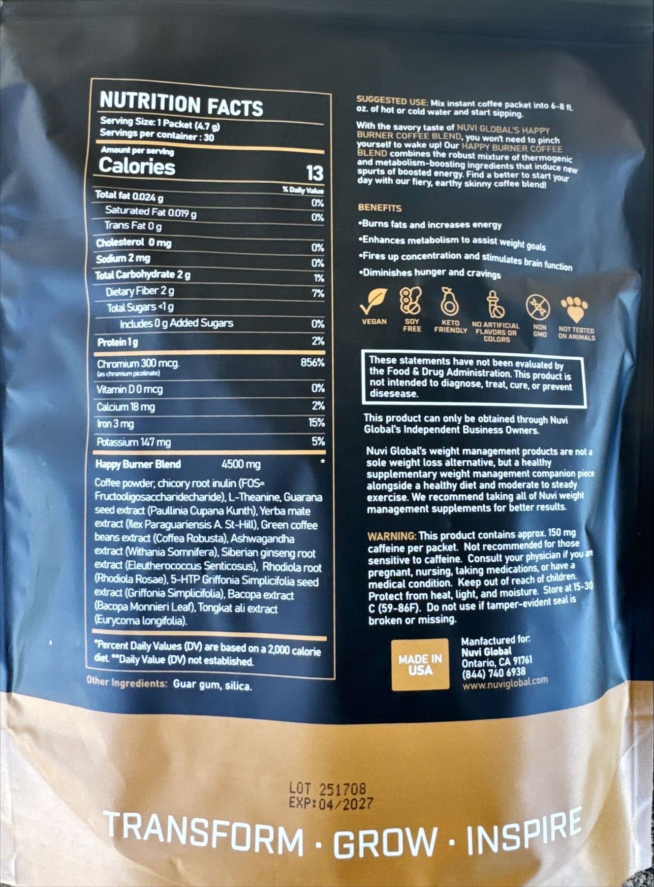 A vegan, soy-free, skinny coffee blend with no artificial flavors, colors, or preservatives. The earthy plant-based blend increases high metabolism, which helps give the fat-incinerators a jolt to our system. Best of all, our Happy Burner fires up the noggin for more focused concentration and brain function and leaves those annoying jitters behind.